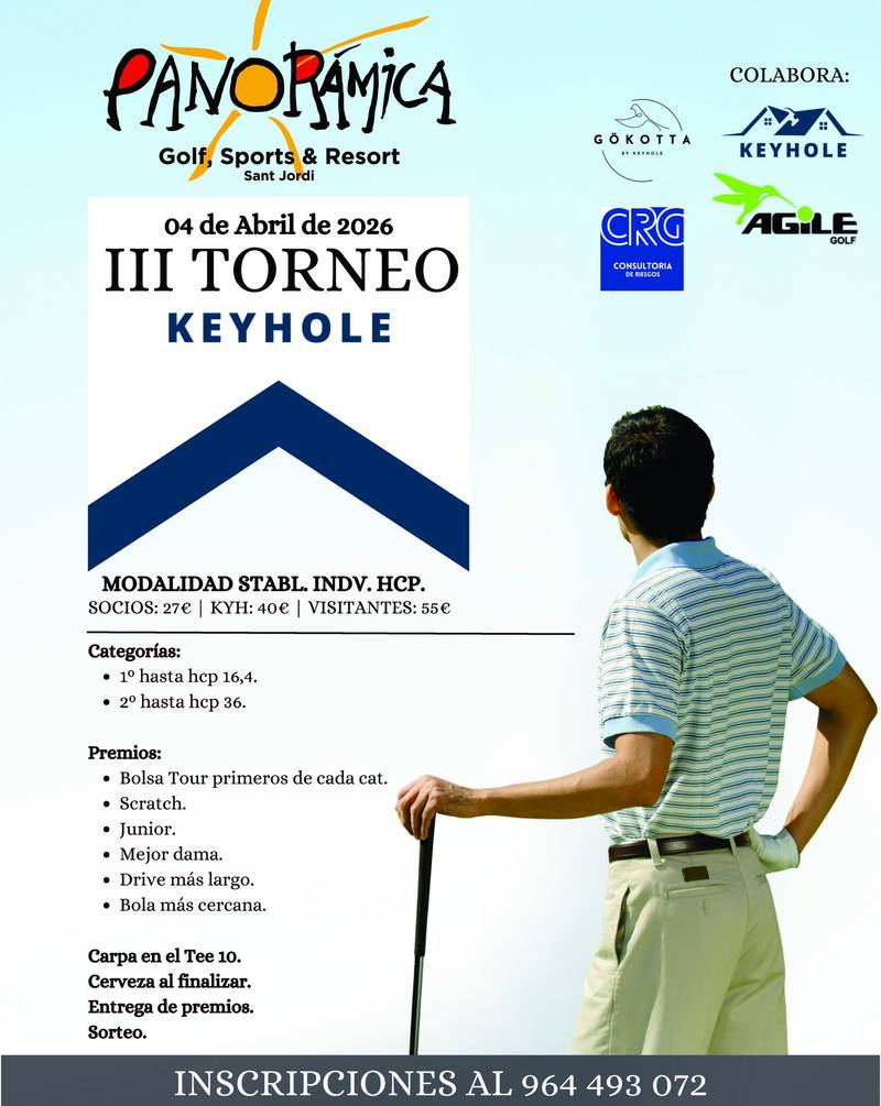 Inicio›Torneos›CASTELLÓN›III Torneo KeyholeIII Torneo KeyholeSábado, 4 de abril de 2026En 5 días⛳Panorámica Golf↗📍CASTELLÓN⛳ InscripciónWhatsApp Compartir torneo←