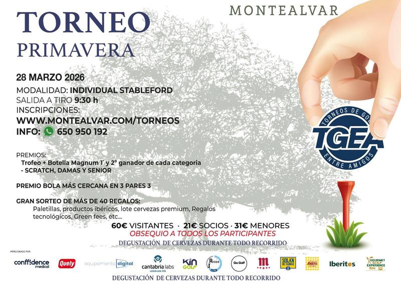 Inicio›Torneos›GUADALAJARA›Torneo Primavera TGEATorneo Primavera TGEASábado, 28 de marzo de 2026En 5 días⛳Montealvar Golf↗📍GUADALAJARAWhatsApp Compartir torneo←