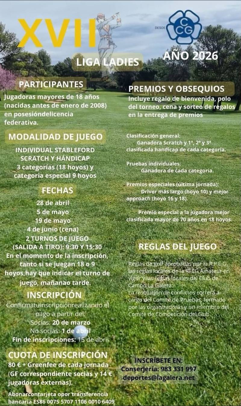 Inicio›Torneos›VALLADOLID›XVII Liga LadiesXVII Liga LadiesMartes, 19 de mayo de 202651 días⛳La Galera Golf↗📍VALLADOLID⛳ InscripciónWhatsApp Compartir torneo←